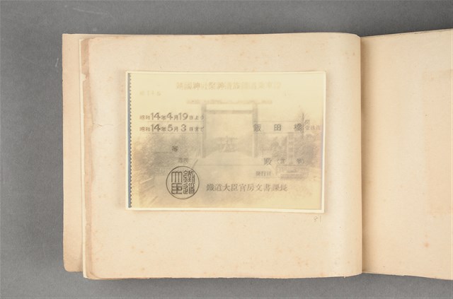 本文物為昭和14年(1939)由鐵道大臣官房文書課長發布的靖國神社祭神遺族鐵道乘車證,為到飯田橋站的車票,其時間從4月19日到5月3日為止,而乘車證中,印有靖國神社之外觀。