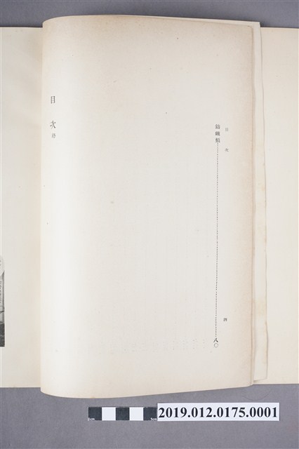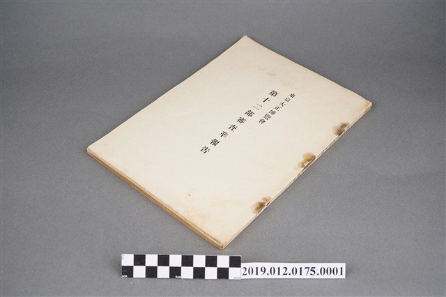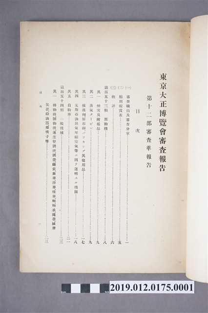 本文物為大正六年(1917)出版的東京大正博覽會第十二部審查準報告,以日文書寫,並附有黑白照片。於末頁處,寫有印刷、發行時間及地點等出版資訊。 為慶祝大正天皇登基,大正3年(1914)3月20日至7月31日,於東京上野舉辦大正博覽會,會場面積達168,000坪,入場人數達7463.000人,而其會場當中,更是引進當時國內外最新穎的科技,如日本最早的電扶梯。在此博覽會中,也設有滿州館、朝鮮館、臺灣館,展示當地物產文化等,而其中臺灣喫茶店更是引發熱潮。