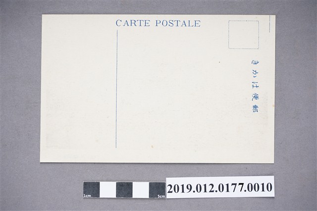 本文物為一日治時期黑白印製的明信片。其內容為大正博覽會第二會場日華貿易館外觀,在正面左上角處,蓋有一章,寫有「東京大正博覽會紀念」、「大正三年自」、「三月至七月」等字樣;在其背面,右側則印有「郵便はかき」、上方則印著「CARTE POSTALE」等字樣。 為慶祝大正天皇登基,大正3年(1914)3月20日至7月31日,於東京上野舉辦大正博覽會,會場面積達168,000坪,入場人數達7463.000人,而其會場當中,更是引進當時國內外最新穎的科技,如日本最早的電扶梯。在此博覽會中,也設有滿州館、朝鮮館、