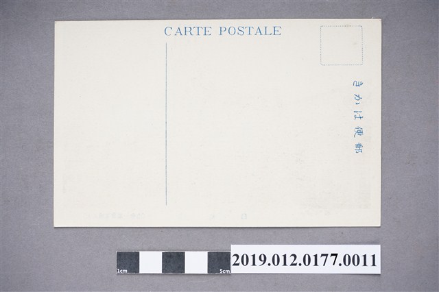 本文物為一日治時期黑白印製的明信片。其內容為大正博覽會第一會場拓殖館外觀,在正面中右上角處,蓋有一章,寫有「東京大正博覽會紀念」、「大正三年自」、「三月至七月」等字樣;在其背面,右側則印有「郵便はかき」、上方則印著「CARTE POSTALE」等字樣。 為慶祝大正天皇登基,大正3年(1914)3月20日至7月31日,於東京上野舉辦大正博覽會,會場面積達168,000坪,入場人數達7463.000人,而其會場當中,更是引進當時國內外最新穎的科技,如日本最早的電扶梯。在此博覽會中,也設有滿州館、朝鮮館、