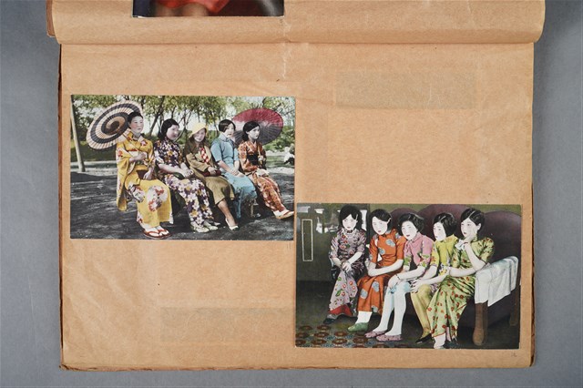 此文物為「時代風俗明信片相片集」中的一張明信片照片,畫面呈現五位女士坐在一處椅子上,畫面最左邊的女士穿著黃色底點綴著花的日式和服,撐著紙傘;左二的女士穿著紫色底點綴著花圖案的中國式旗袍,手拿著綠色包包;中間的女士穿著綠色套裝,頭戴黃色帽子;右二的女士穿著藍中國式旗袍;最右邊的女士穿著橘色格子日式和服,手撐著紙傘。