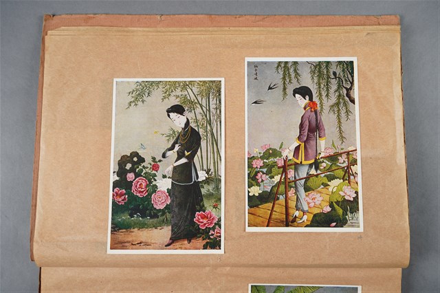 此文物為「時代風俗明信片相片集」中的一張明信片照片,畫面呈現一位女士穿著半身旗袍及長褲站在開滿蓮花的蓮花池旁的木棧道上,旁邊有柳樹及燕子。