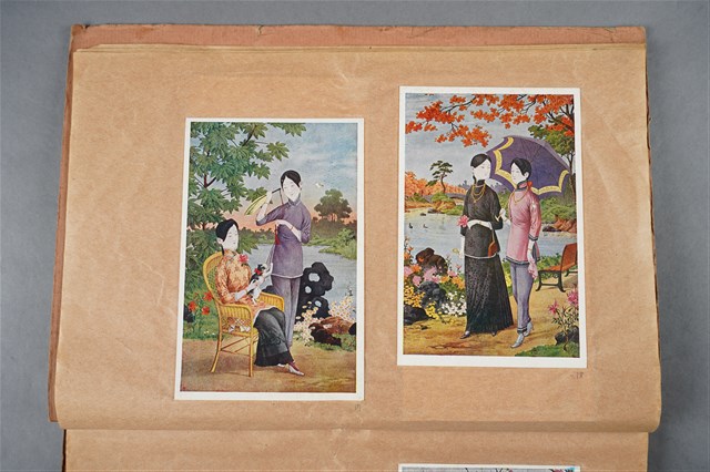 此文物為「時代風俗明信片相片集」中的一張明信片照片,畫面呈現兩位女士在池塘邊散步,一位女士穿著黑色旗袍及長裙;另一位女士穿著粉色旗袍及長褲並撐著傘,她們身旁有一些花叢及樹。