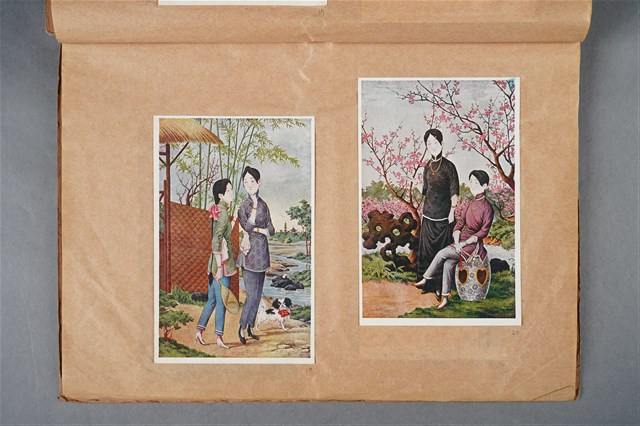 此文物為「時代風俗明信片相片集」中的一張明信片照片,畫面呈現兩位女士,坐著的女士穿著紫色旗袍及長褲;另一位站著的女士穿著黑色旗袍及長裙,她們身後有一條小河及一些開滿櫻花的櫻花樹。