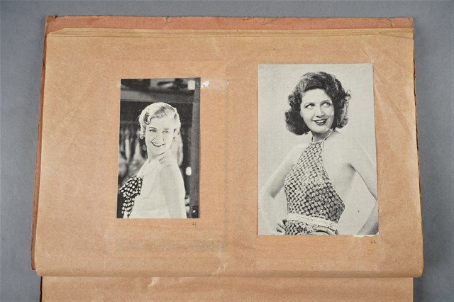 此文物為「時代風俗明信片相片集」中的一張明信片照片,畫面呈現黑白畫面,畫面中有一位外國女士正在笑,她穿著白色背心,胸前有一個點點圖案的蝴蝶結。