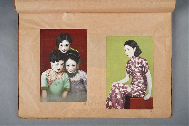 此文物為「時代風俗明信片相片集」中的一張明信片照片,畫面呈現一位短髮女士坐在咖啡色箱子上,她穿著白色底有著紫色花圖案的旗袍,背景為綠色。