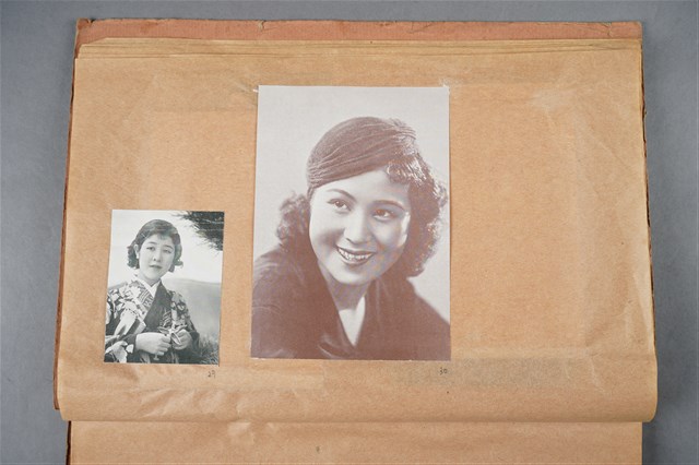 此文物為「時代風俗明信片相片集」中的一張明信片照片,畫面呈現黑白畫面,畫面中有一位穿著黑色衣服正在笑著的短髮女人。