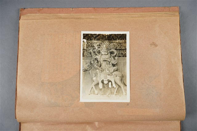 此文物為「時代風俗明信片相片集」中的一張明信片照片,畫面呈現黑白畫面,畫面中是一座騎著馬的佛像,佛像表情嚴肅,坐姿霸氣。