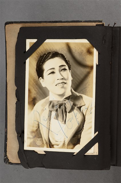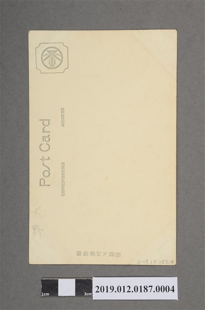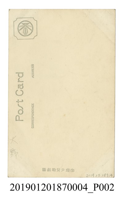 本文物為日本寶塚劇團劇照,照片中女星將頭髮束成男生的短髮,戴著蝴蝶結,身穿紳士外套,眼神凝視遠方。照片左下角附有寶塚的標誌。