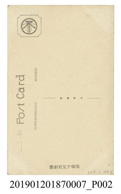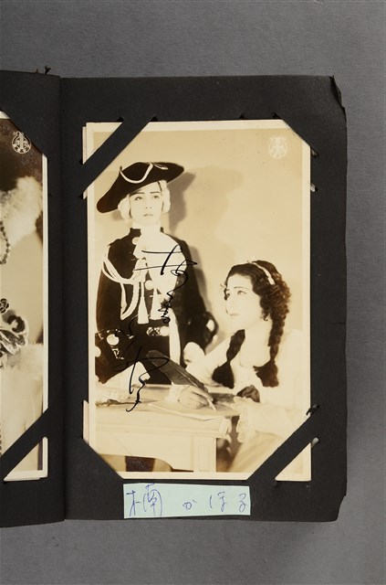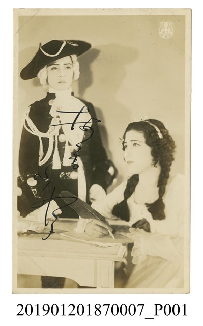 本文物為楠かほ子劇照,照片中楠かほ子扮成寫信的少女,戴髮箍紮辮子,手持羽毛筆。而旁邊站著另一名穿著船長服飾的女子。