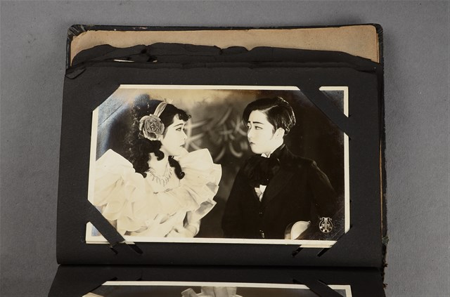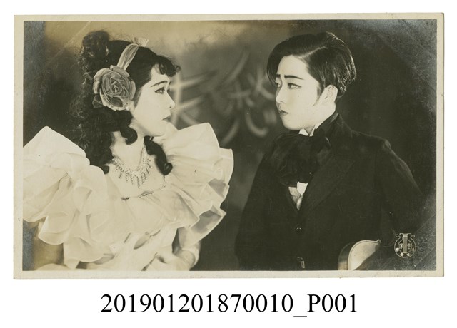 本文物為寶塚劇團男女對望劇照,照片中有一名女演員所扮之男性, 梳油頭身穿西。另一名女性身穿公主袖禮服,頭上戴玫瑰裝飾物。兩人深情對望。