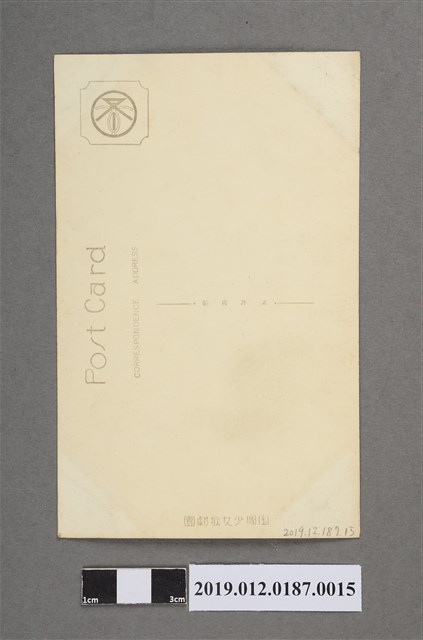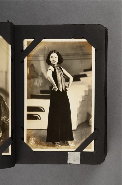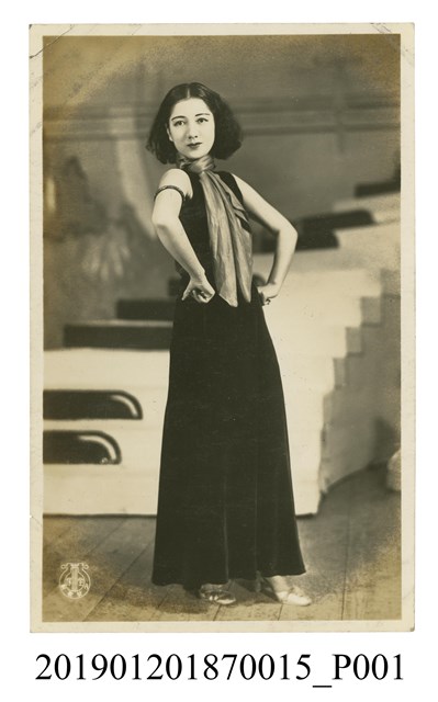 本文物為寶塚劇團圍絲巾女子劇照,照片中的女子髮型為中長捲髮。身著短袖與長裙,脖子圍著絲巾。女子雙手叉腰,眼睛凝視遠方。