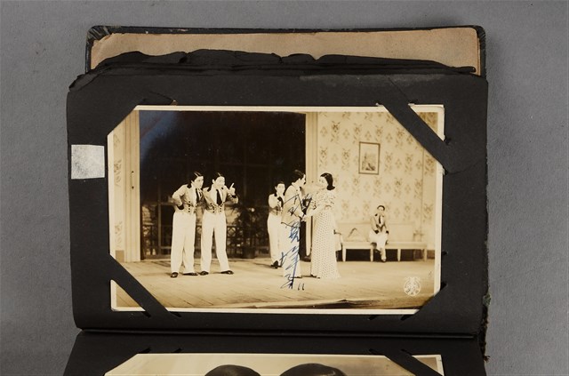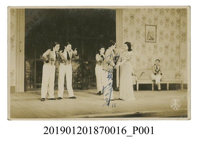 本文物為寶塚劇團劇照,內有五名女演員所扮之男性,皆身穿西裝與皮鞋。另外一名則扮演女性,穿著碎花洋裝與其中一名男角色雙手緊握。照片上有該劇團女星之簽名。