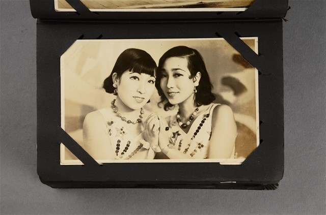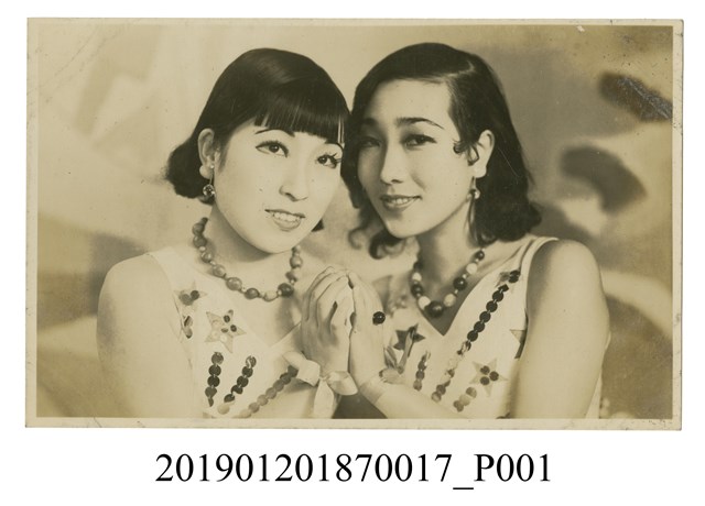 本文物為寶塚劇團二女子合照,照片中兩名女子都穿著相同服裝,該服裝上鑲滿了亮片。而脖子的部分還帶有深色與淺色相間的珠子項鍊。
