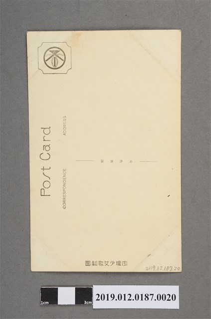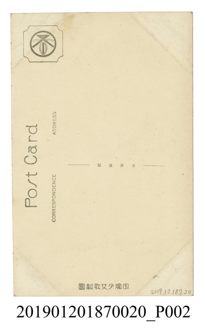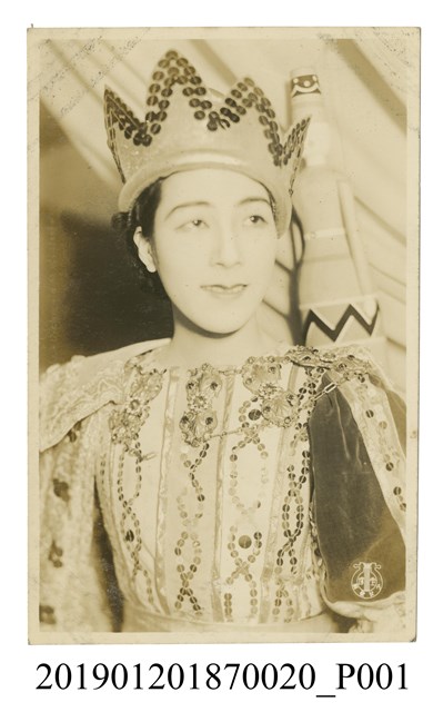 本文物為寶塚劇團戴皇冠女子劇照,該照片中的女子身穿滿是亮片的西洋皇室戲服,頭上也是以亮片裝飾之皇冠。照片右下角有寶塚劇團的標誌。