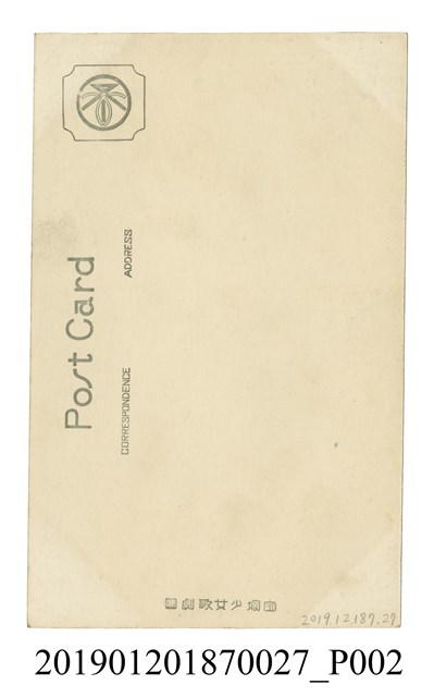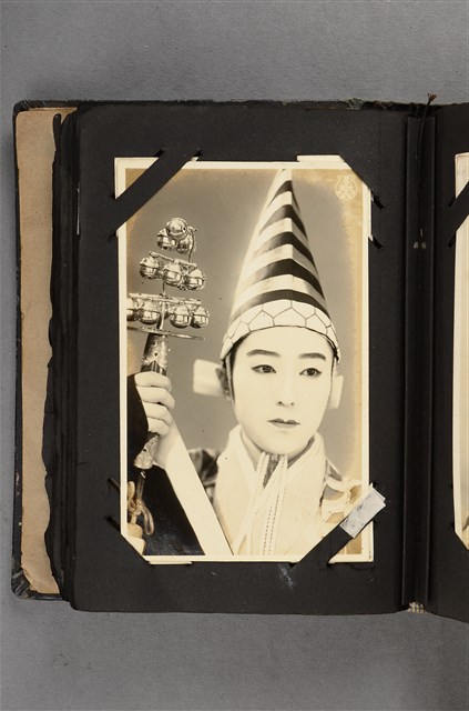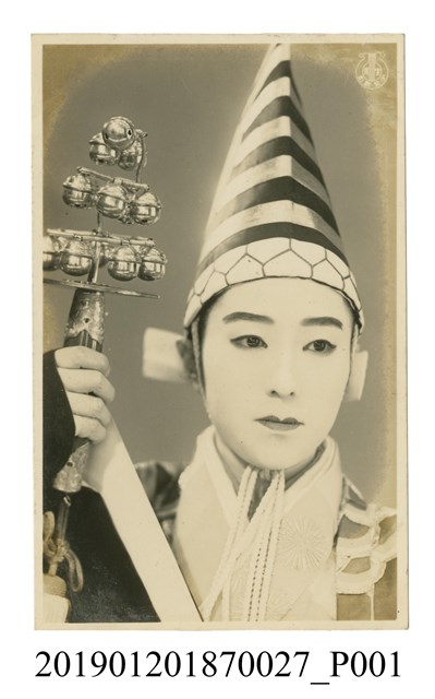 本文物為寶塚劇團陰陽師劇照,照片中的女子穿著仿日本古代貴族之狩衣戲服,手持神樂鈴。該女子扮演陰陽師貌。