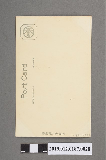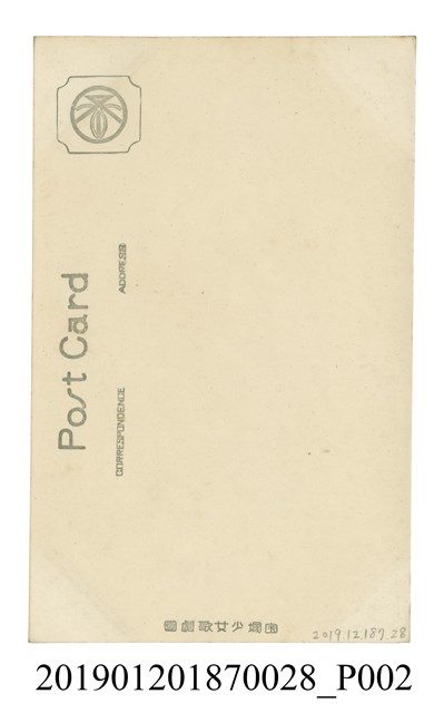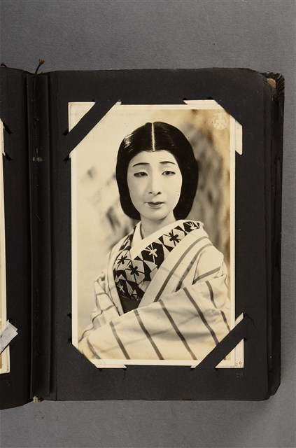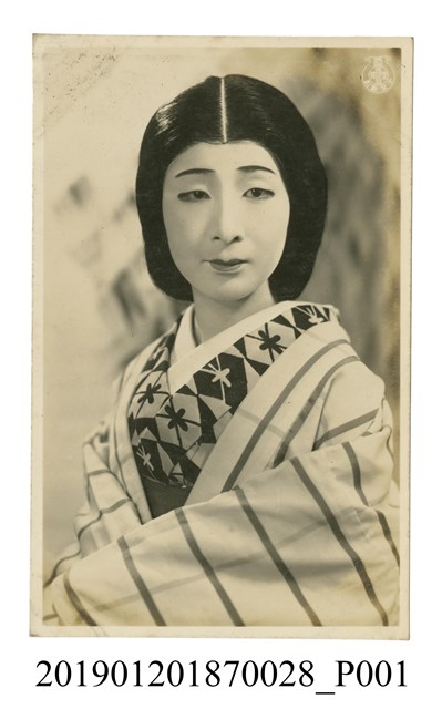 本文物為寶塚劇團日本古裝女子劇照,照片中的女子穿著日本傳統和服,該和服的花樣由十字與三角型組合而成,此女子在和服外又穿條紋羽織。