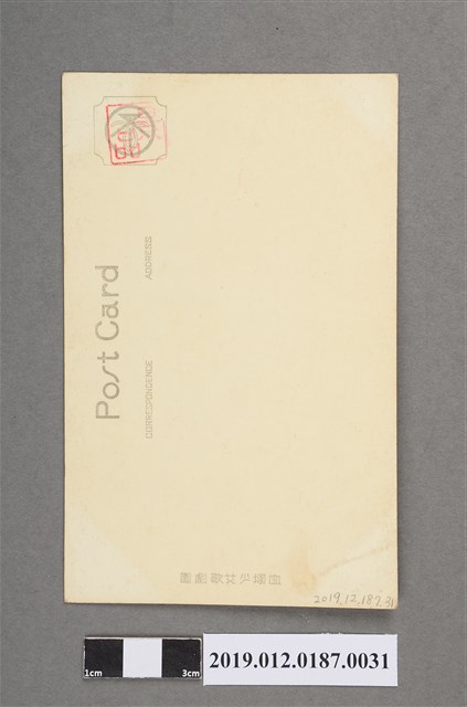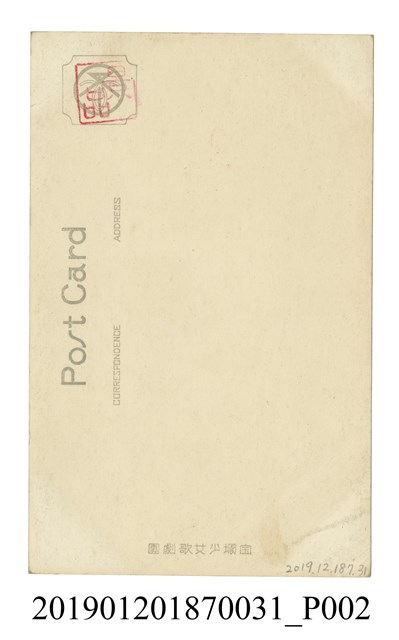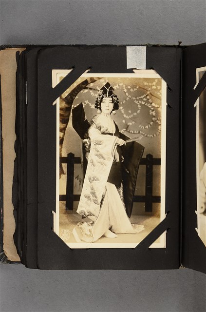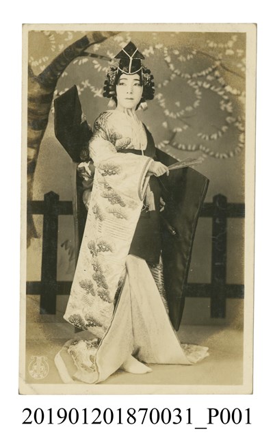本文物為寶塚劇團和服女子劇照,照片中的女子穿著日本傳統服飾,該和服振袖較長,且繡有松樹等圖樣。此女子右手持扇,頭上有頭飾。