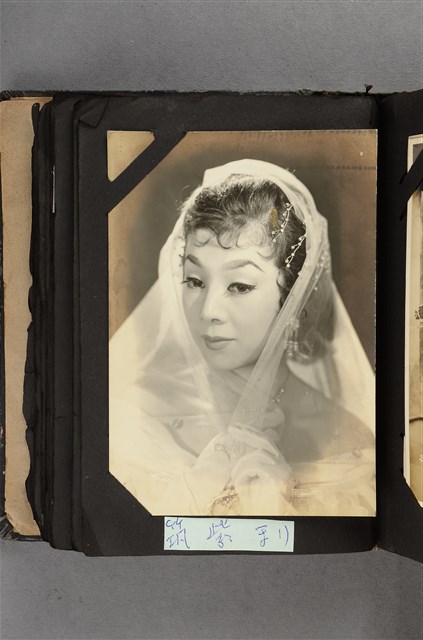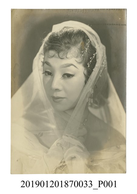 本文物為寶塚劇團筑紫照片,該照片中筑紫穿著西式婚紗,手上戴著白色手套,其將頭髮盤起來,且頭上也披著白色頭紗。