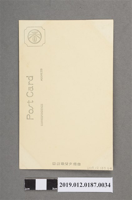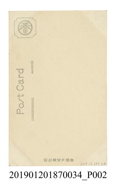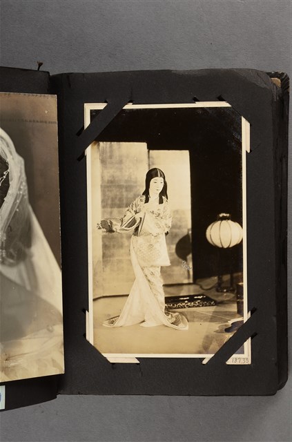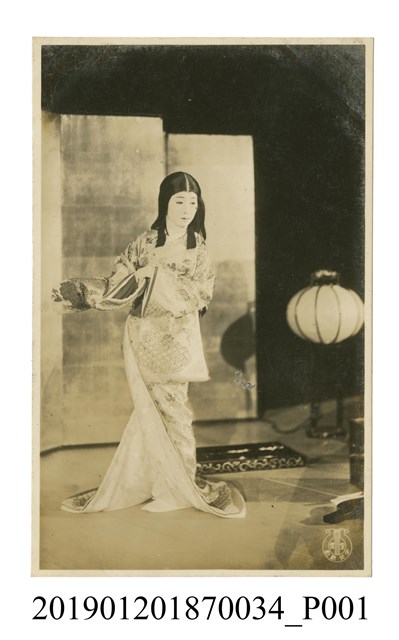 本文物為寶塚劇團和服女子劇照,照片中的女子穿著日本傳統服飾,繡有菊花等圖樣。此女子左手抓著右手的振袖。