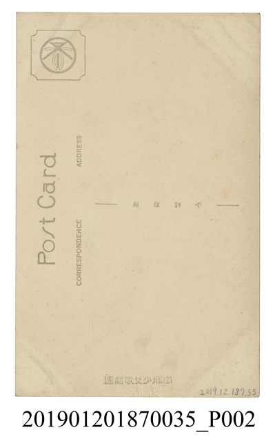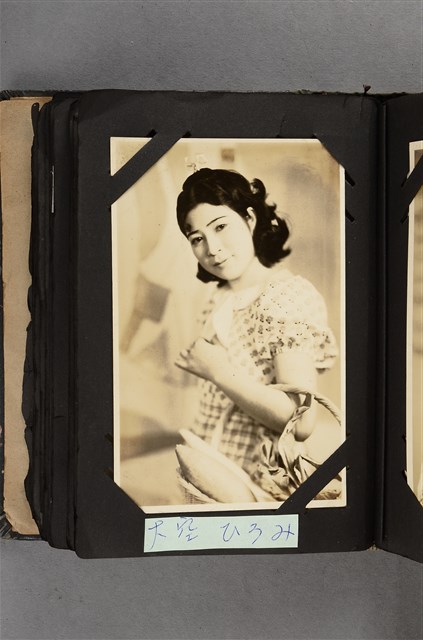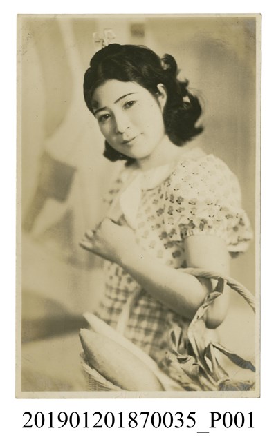 本文物為大空飛祐劇照,該照中大空身著洋裝,手提菜籃,買菜貌。大空飛祐又稱大空ひろみ,為寶塚歌劇團昭和4年第18期生。照片中大空雙手食指碰觸臉龐,做出微笑有酒窩的模樣。