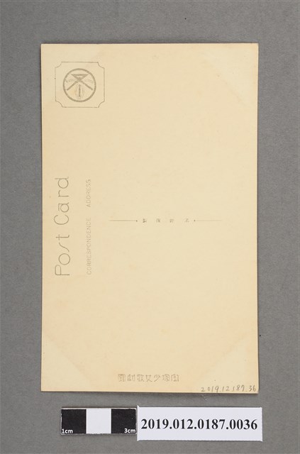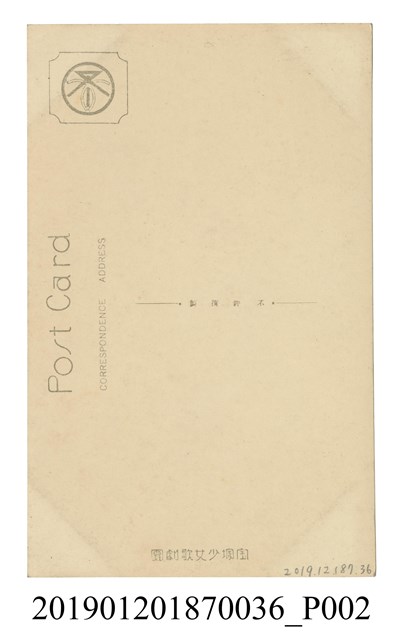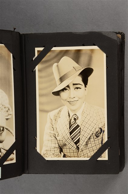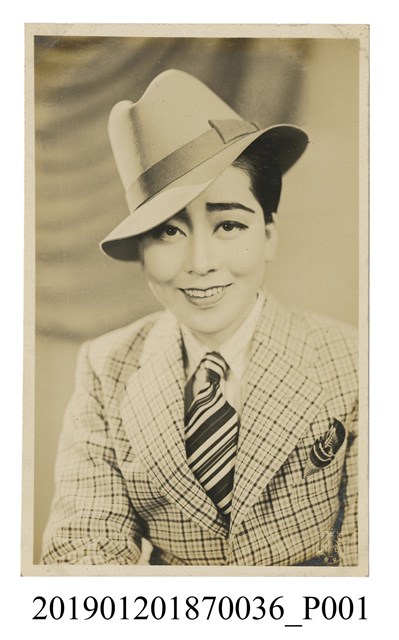 本文物為寶塚劇團戴紳士帽演員劇照,照片中的女子穿著格紋西裝外套,白色襯衫,條紋領結。頭上戴了一頂紳士帽。