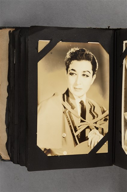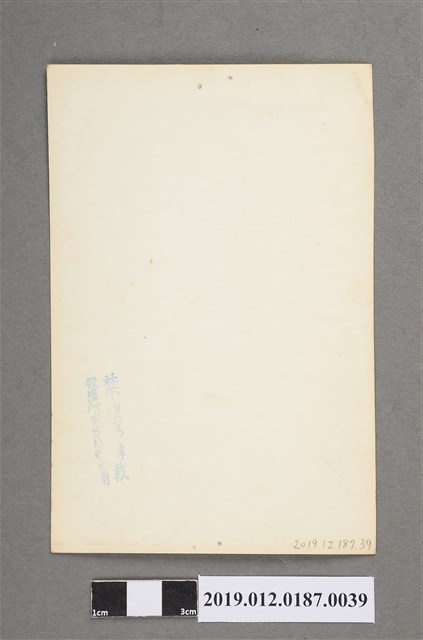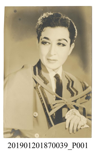 本文物為寶塚劇團西裝男子劇照,照片中的女子穿著襯衫,搭配領帶以及西裝外套,頭髮梳成男性油頭,西裝外套外面有一披肩。