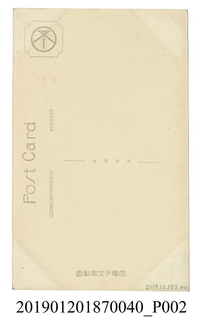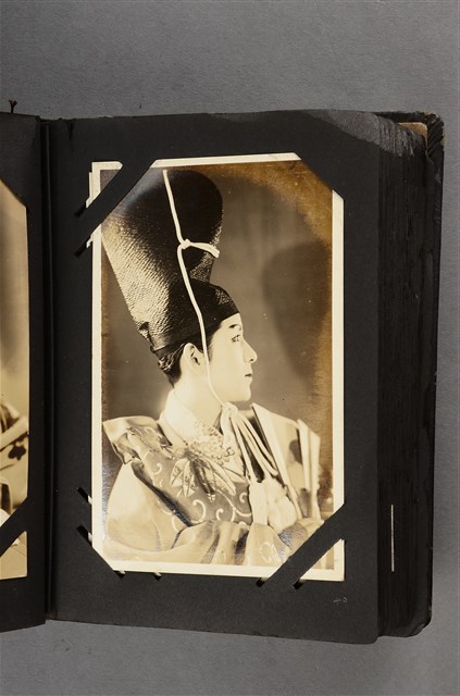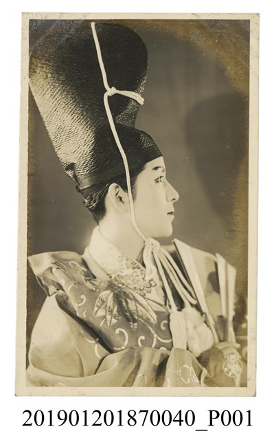 本文物為寶塚劇團狩衣男子劇照,照片中的女子穿著仿日本古代貴族之狩衣戲服,頭戴古代日本貴族之高帽,手持包裹。該女子扮演日本古代貴族男性貌。