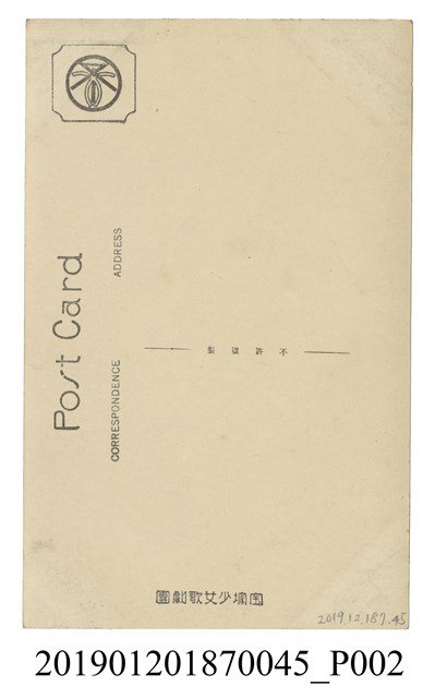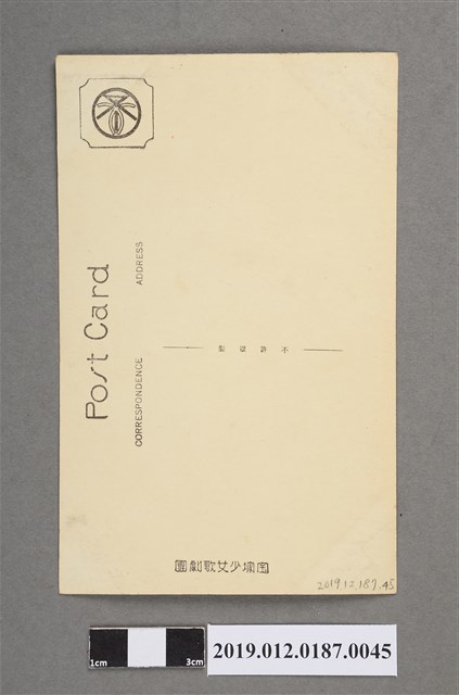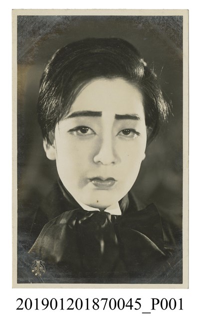 本文物為寶塚劇團西裝男子劇照,照片中的女子穿著襯衫,搭配蝴蝶結領帶以及西裝外套,頭髮梳成男性油頭。