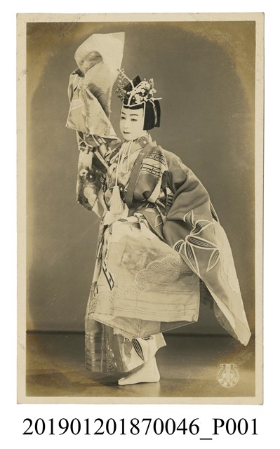 本文物為寶塚劇團歌舞妓劇照,照片中的女子穿著歌舞妓的演藝服,頭髮梳成髻並以頭飾裝飾。該女子一手朝上一手伴隨著抬腳而插腰。