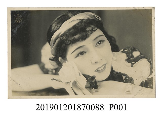 本文物為寶塚劇團帶頭飾女人劇照,該照中女星頭髮與瀏海燙捲,並且在頭飾圍繞額頭裝飾。該女星趴在桌上,望向遠方。