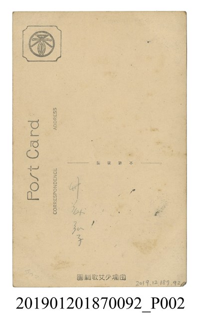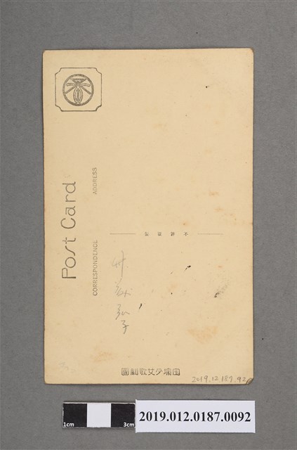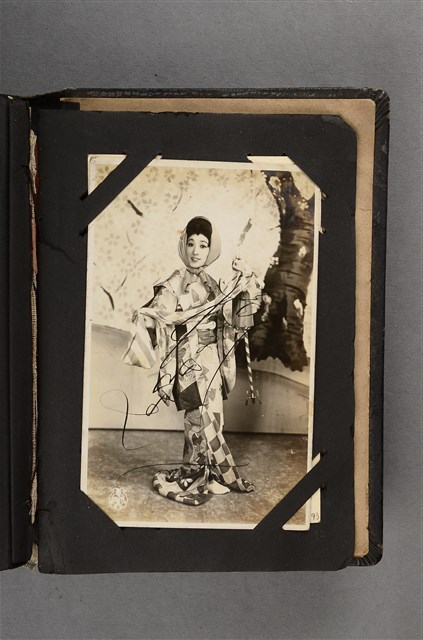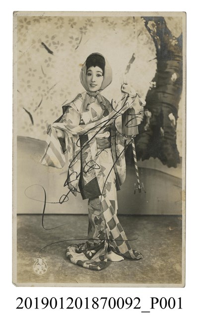 本文物為寶塚劇團藝妓劇照,照片中之女明星梳著髮髻,再以布包起。身穿幾何圖案之和服,右手一邊持道具,一邊拉著左手之振袖。