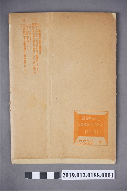 本文物為日本電影明星人氣名鑑,昭和15年(1941)版本,內容記載當年多位人氣明星的本名、出生年月、出生地、簡歷、興趣嗜好等,發行及編輯人為梓川真砂春,定價十七錢。
