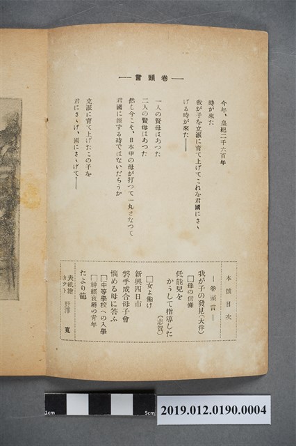本文物為《母之友》雜誌第4卷第1號,昭和15年(1940)1月由日本母子會發行。內容包含母的信條、女性工作等。當中一篇提到如何執導身心障礙兒童,在教育上要從哪些方面指導。