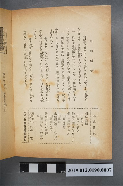 本文物為《母之友》雜誌第4卷第4號,昭和15年(1940)4月由日本母子會發行。提及母的信條、性格問題等內容。其中一篇提及孩子應當接受的教育,要從家庭教育做起,需要日夜督促指導學習才行。