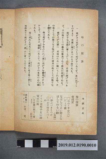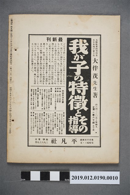 本文物為《母之友》雜誌第4卷第7號,昭和15年(1940)7月由日本母子會發行。內容包含母的信條、德國青年子女的國家奉仕隊等。這期提到關於癖好,好的癖好急壞的癖好,以這些癖好來討論該如何教育孩子。