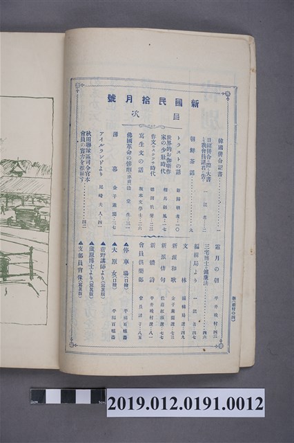 本文物為《新國民》雜誌第12卷第1號,由大日本國民中學會發行。內容提及朝鮮茶話、韓國併合詔書。本期專欄-托拉斯之話,當中提到屠宰業及世界食糧等問題。