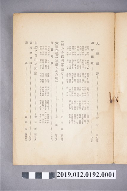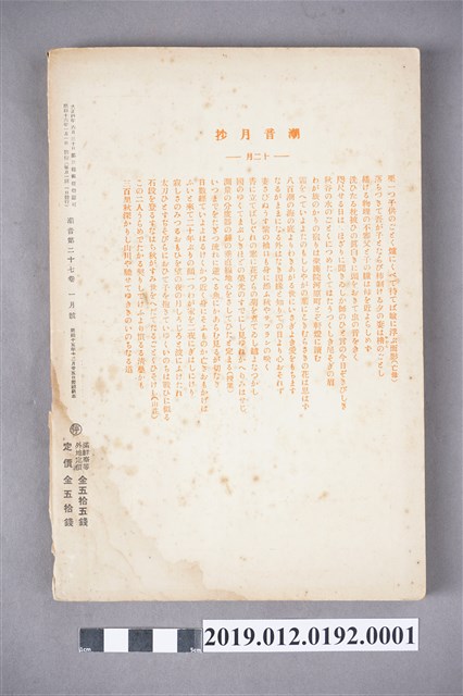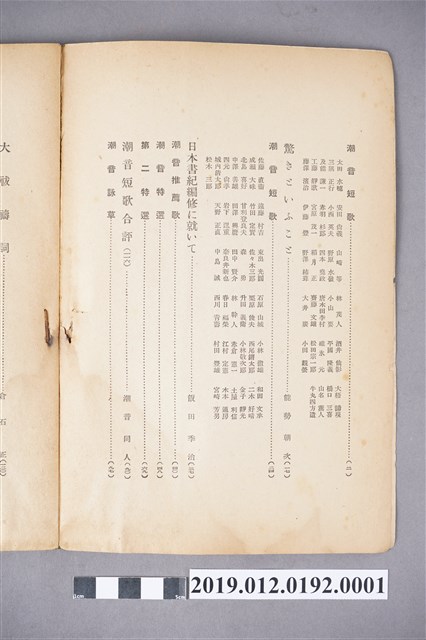 《潮音》第27卷1月號,發行日昭和16年(1941年)1月1日。主要內容以介紹歌曲為主,主要分為潮音短歌、驚きそいふそ、日本書紀編修に就いて、潮音短歌合評、各地歌會報、消息等部分。