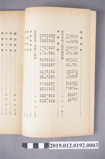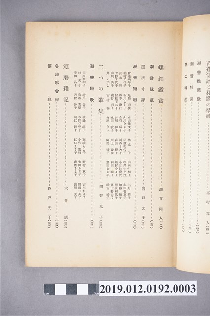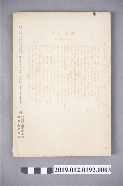 《潮音》第27卷3月號,發行日昭和16年(1941年)3月1日。主要內容以介紹歌曲為主,主要分為潮音短歌潮音短歌合評、新古今集の幻術的作風、芭蕉俳諧そ和歌の精神、潮音推薦歌、潮音特選、潮音詠章、各地歌會報、消息等部分。