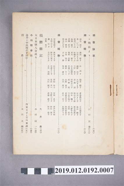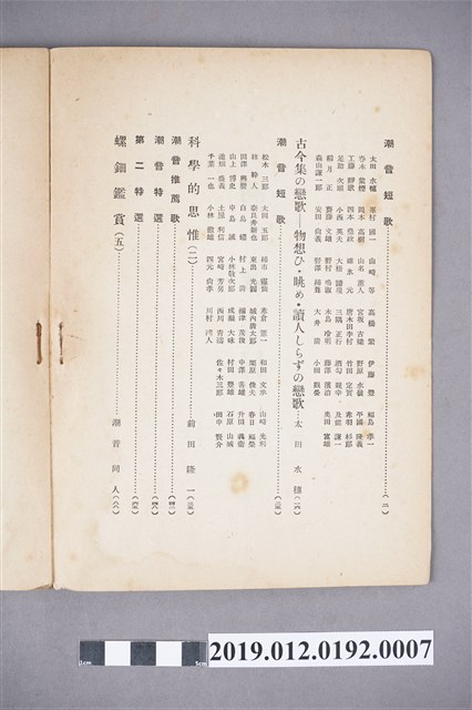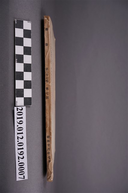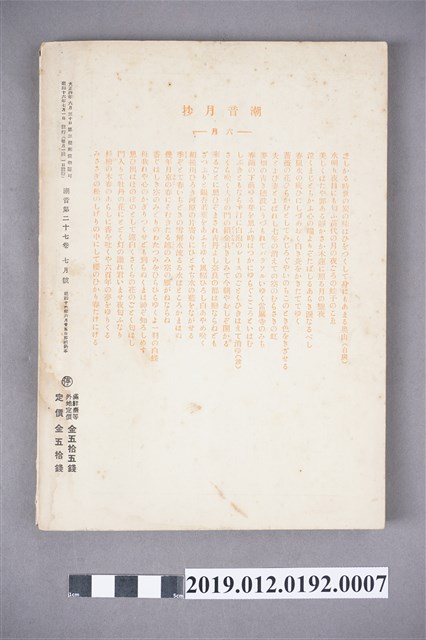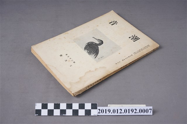 本文物為昭和16年(1941年)7月1日所發行的潮音雜誌第27卷7月號,其封面為一鳥類,全書以日文書寫,內容為短歌、詩歌等,在末頁,則附有相關出版社的活動訊息及相關投稿的規約。潮音雜誌的出版社為潮音社,其編輯兼發行人為太田貞一,其定價為金50錢,而朝鮮、臺灣等外地則為金55錢。 期刊被命名為雜誌,雜誌一詞,其起源有二,有一說為中國古代紀載傳說、故事等的筆記,所產生的古詞語,在1862年倫敦傳教會的麥嘉湖創辦《中外雜誌》,其英文名為Chinese and Foreign Miscellany,即具有雜集