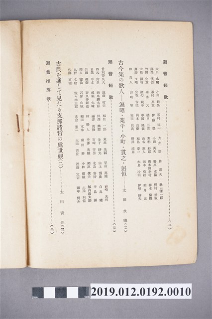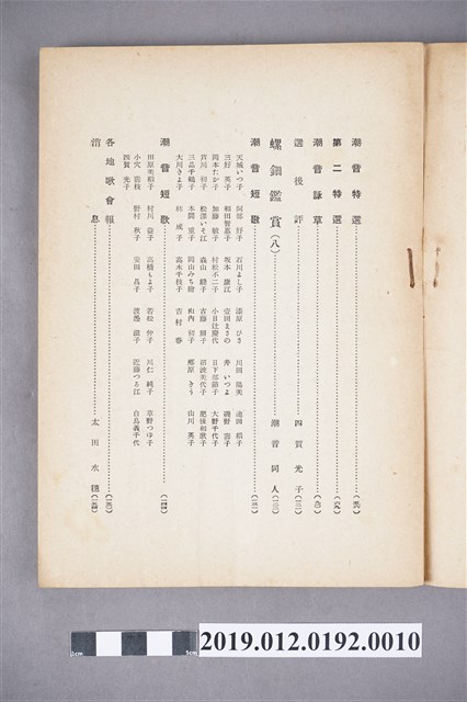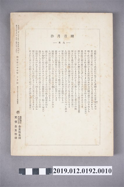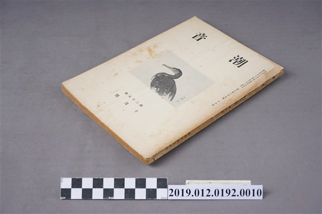 本文物為昭和16年(1941年)10月1日所發行的潮音雜誌第27卷第10號,其封面為一鳥類,全書以日文書寫,內容為短歌、詩歌等,在末頁,則附有相關出版社的活動訊息及相關投稿的規約。潮音雜誌的出版社為潮音社,其編輯兼發行人為太田貞一,其定價為金50錢,而朝鮮、臺灣等外地則為金55錢。 期刊被命名為雜誌,雜誌一詞,其起源有二,有一說為中國古代紀載傳說、故事等的筆記,所產生的古詞語,在1862年倫敦傳教會的麥嘉湖創辦《中外雜誌》,其英文名為Chinese and Foreign Miscellany,即具有