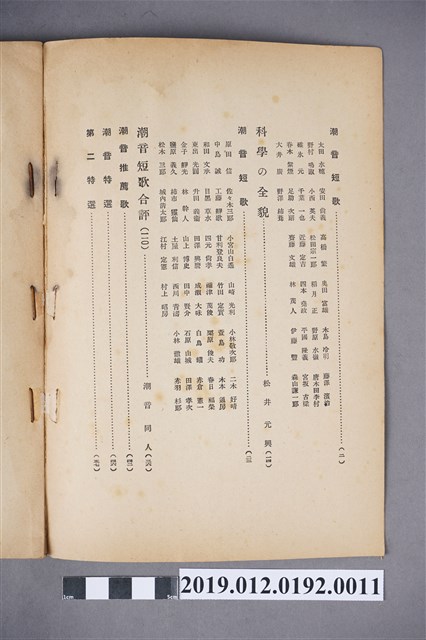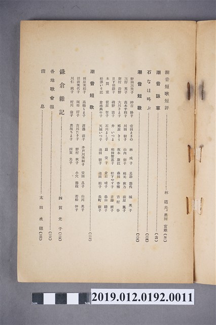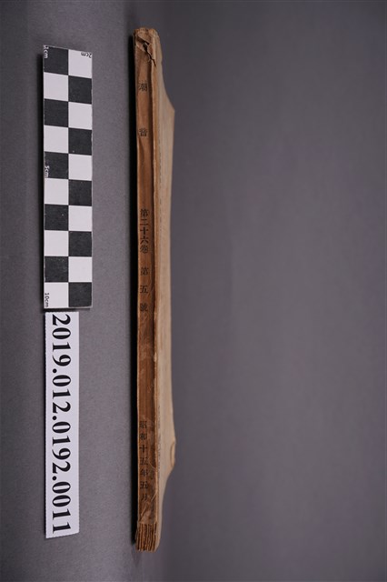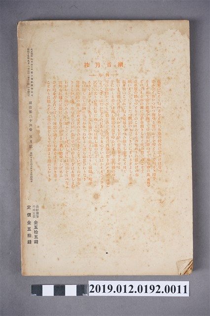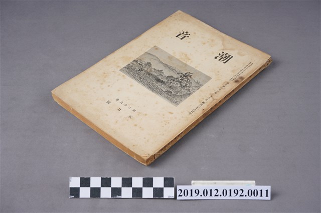 本文物為昭和15年(1940年)5月1日所發行的潮音雜誌第26卷5月號,其封面為田園景觀,除農田作物、還畫有建築物。全書以日文書寫,內容為短歌、詩歌等,在末頁,則附有相關出版社的活動訊息及相關投稿的規約。潮音雜誌的出版社為潮音社,其編輯兼發行人為太田貞一,其定價為金50錢,而朝鮮、臺灣等外地則為金55錢。 期刊被命名為雜誌,雜誌一詞,其起源有二,有一說為中國古代紀載傳說、故事等的筆記,所產生的古詞語,在1862年倫敦傳教會的麥嘉湖創辦《中外雜誌》,其英文名為Chinese and Foreign Mi