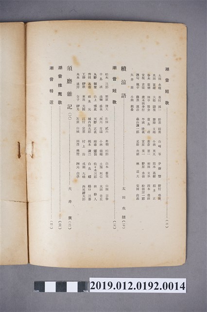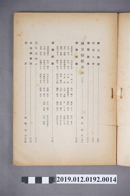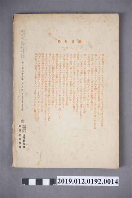 本文物為昭和15年(1940年)9月1日所發行的潮音雜誌第26卷9月號,其封面為田園景觀,除農田作物、還畫有建築物。全書以日文書寫,內容為短歌、詩歌等,在末頁,則附有相關出版社的活動訊息及相關投稿的規約。潮音雜誌的出版社為潮音社,其編輯兼發行人為太田貞一,其定價為金50錢,而朝鮮、臺灣等外地則為金55錢。 期刊被命名為雜誌,雜誌一詞,其起源有二,有一說為中國古代紀載傳說、故事等的筆記,所產生的古詞語,在1862年倫敦傳教會的麥嘉湖創辦《中外雜誌》,其英文名為Chinese and Foreign Mi
