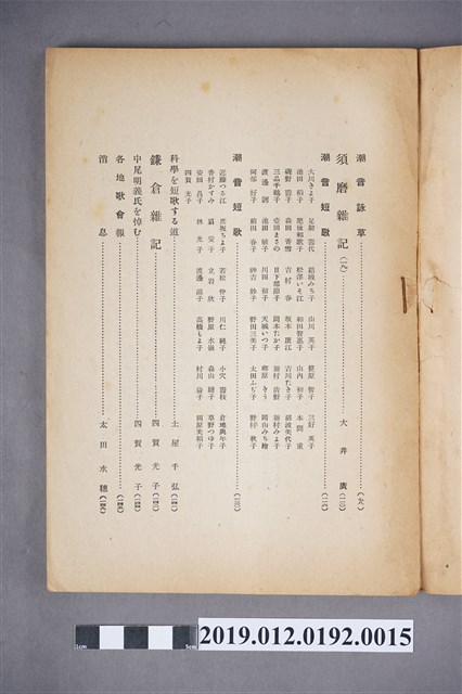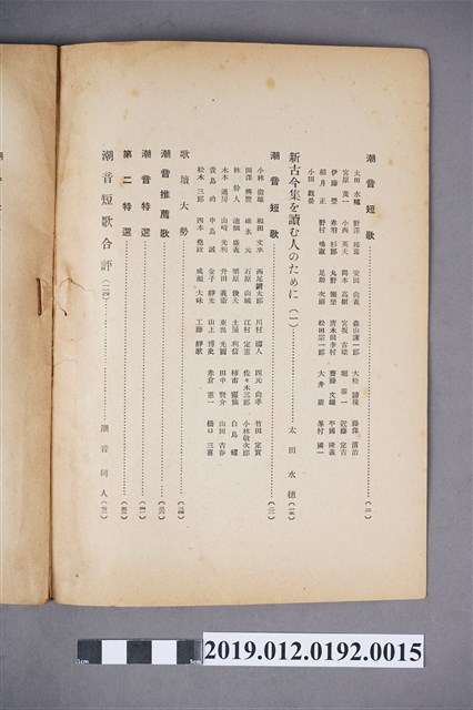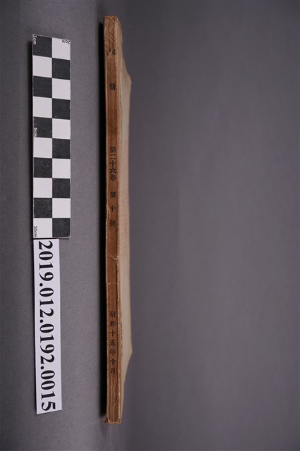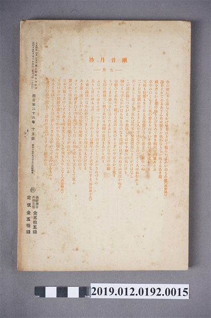 本文物為昭和15年(1940年)10月1日所發行的潮音雜誌第26卷10月號,其封面為田園景觀,除農田作物、還畫有建築物。全書以日文書寫,內容為短歌、詩歌等,在末頁,則附有相關出版社的活動訊息及相關投稿的規約。潮音雜誌的出版社為潮音社,其編輯兼發行人為太田貞一,其定價為金50錢,而朝鮮、臺灣等外地則為金55錢。 期刊被命名為雜誌,雜誌一詞,其起源有二,有一說為中國古代紀載傳說、故事等的筆記,所產生的古詞語,在1862年倫敦傳教會的麥嘉湖創辦《中外雜誌》,其英文名為Chinese and Foreign