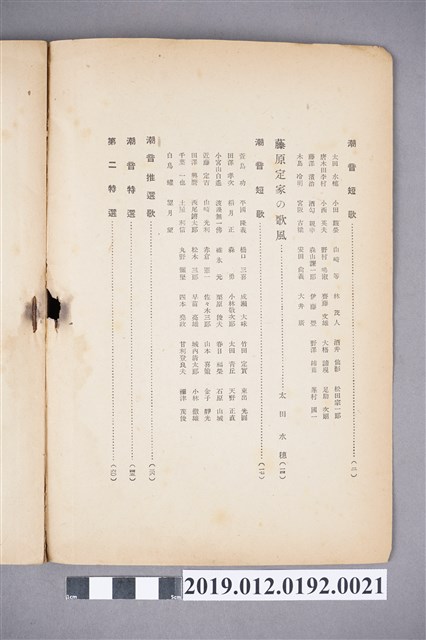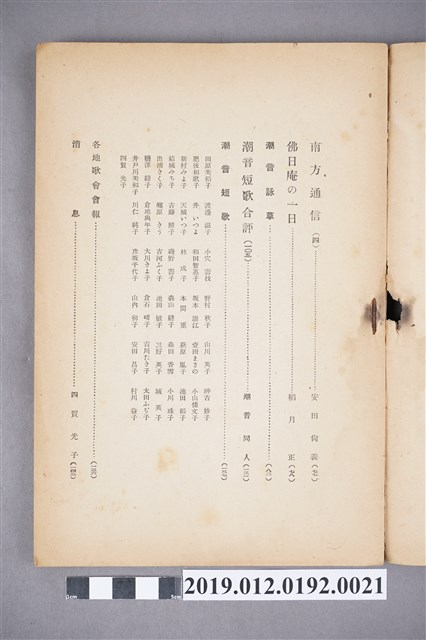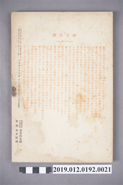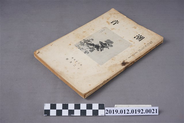 本文物為昭和14年(1939年)12月1日所發行的潮音雜誌第25卷12月號,以花的圖案為其面。全書以日文書寫,內容為短歌、詩歌等,在末頁,則附有相關出版社的活動訊息及相關投稿的規約。潮音雜誌的出版社為潮音社,其編輯兼發行人為太田貞一,其定價為金50錢,而朝鮮、臺灣等外地則為金55錢。 期刊被命名為雜誌,雜誌一詞,其起源有二,有一說為中國古代紀載傳說、故事等的筆記,所產生的古詞語,在1862年倫敦傳教會的麥嘉湖創辦《中外雜誌》,其英文名為Chinese and Foreign Miscellany,即