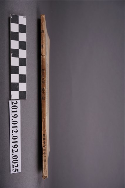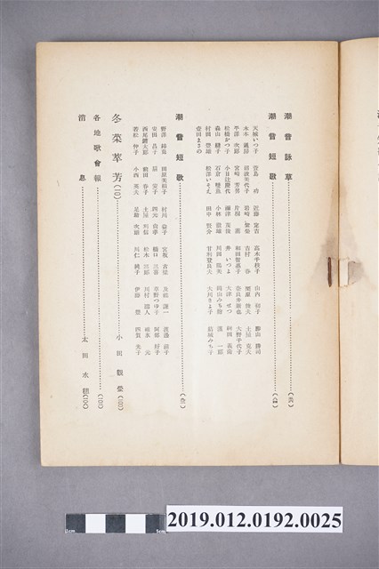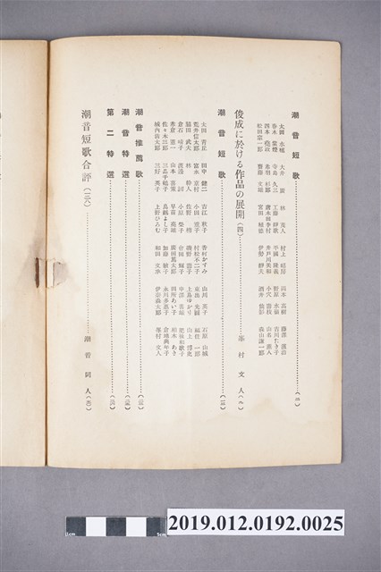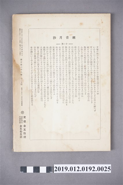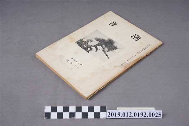 本文物為昭和17年(1942年)12月1日所發行的潮音雜誌第28卷12月號,以松柏為其封面。全書以日文書寫,內容為短歌、詩歌等,在末頁,則附有相關出版社的活動訊息及相關投稿的規約。潮音雜誌的出版社為潮音社,其編輯兼發行人為太田貞一,其定價為金50錢,而朝鮮、臺灣等外地則為金55錢。 期刊被命名為雜誌,雜誌一詞,其起源有二,有一說為中國古代紀載傳說、故事等的筆記,所產生的古詞語,在1862年倫敦傳教會的麥嘉湖創辦《中外雜誌》,其英文名為Chinese and Foreign Miscellany,即具