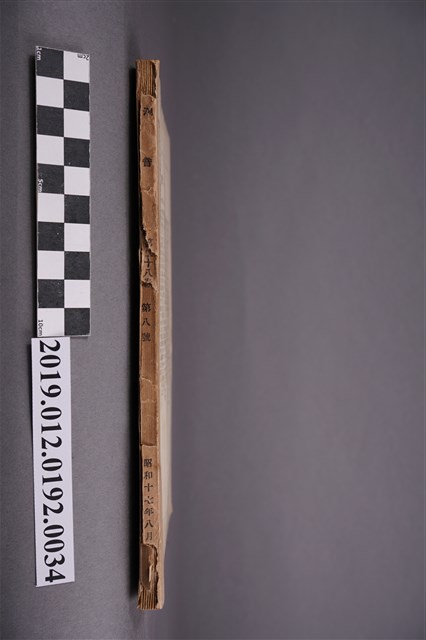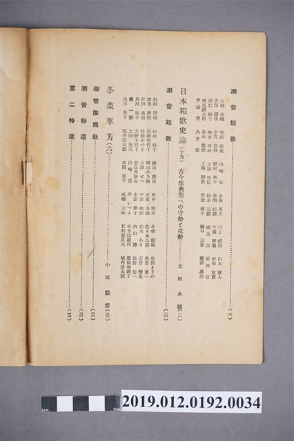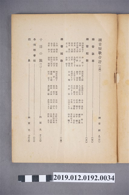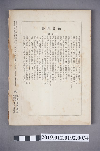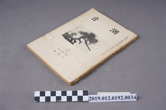本文物為昭和17年(1942年)8月1日所發行的潮音雜誌第28卷8月號,以松柏為其封面。全書以日文書寫,內容為短歌、詩歌等,在末頁,則附有相關出版社的活動訊息及相關投稿的規約。潮音雜誌的出版社為潮音社,其編輯兼發行人為太田貞一,其定價為金50錢,而朝鮮、臺灣等外地則為金55錢。 期刊被命名為雜誌,雜誌一詞,其起源有二,有一說為中國古代紀載傳說、故事等的筆記,所產生的古詞語,在1862年倫敦傳教會的麥嘉湖創辦《中外雜誌》,其英文名為Chinese and Foreign Miscellany,即具有雜