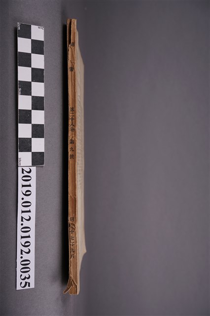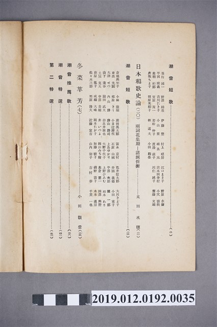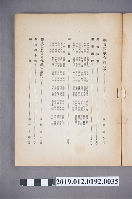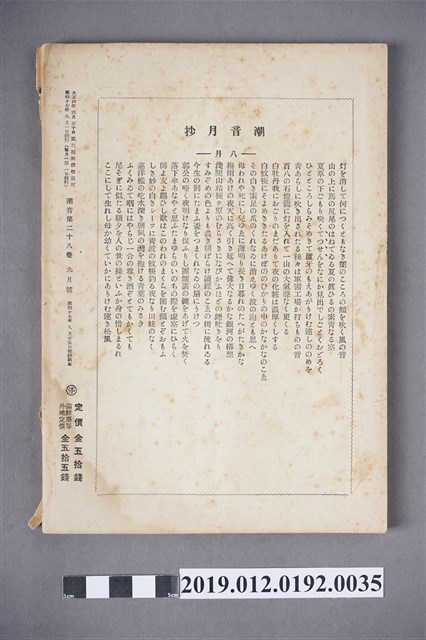 本文物為昭和17年(1942年)9月1日所發行的潮音雜誌第28卷9月號,以松柏為其封面。全書以日文書寫,內容為短歌、詩歌等,在末頁,則附有相關出版社的活動訊息及相關投稿的規約。潮音雜誌的出版社為潮音社,其編輯兼發行人為太田貞一,其定價為金50錢,而朝鮮、臺灣等外地則為金55錢。 期刊被命名為雜誌,雜誌一詞,其起源有二,有一說為中國古代紀載傳說、故事等的筆記,所產生的古詞語,在1862年倫敦傳教會的麥嘉湖創辦《中外雜誌》,其英文名為Chinese and Foreign Miscellany,即具有雜