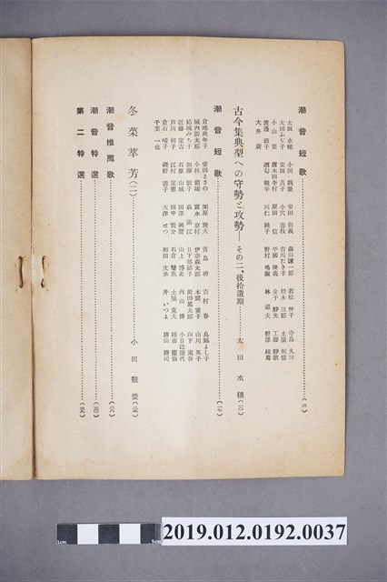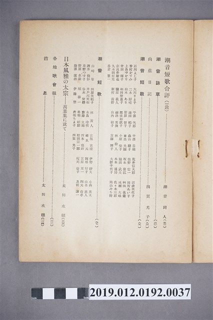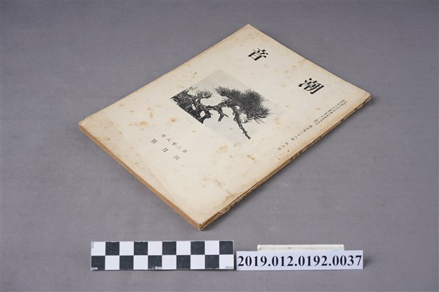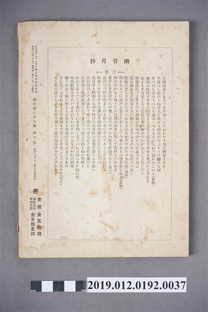本文物為昭和17年(1942年)4月1日所發行的潮音雜誌第28卷4月號,以松柏為其封面。全書以日文書寫,內容為短歌、詩歌等,在末頁,則附有相關出版社的活動訊息及相關投稿的規約。潮音雜誌的出版社為潮音社,其編輯兼發行人為太田貞一,其定價為金50錢,而朝鮮、臺灣等外地則為金55錢。 期刊被命名為雜誌,雜誌一詞,其起源有二,有一說為中國古代紀載傳說、故事等的筆記,所產生的古詞語,在1862年倫敦傳教會的麥嘉湖創辦《中外雜誌》,其英文名為Chinese and Foreign Miscellany,即具有雜