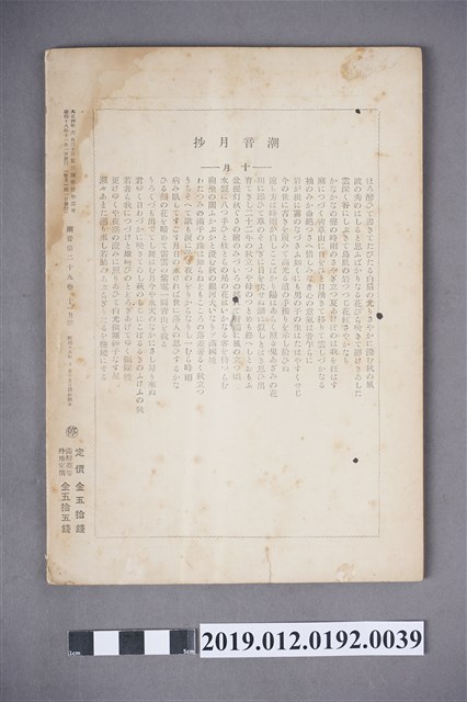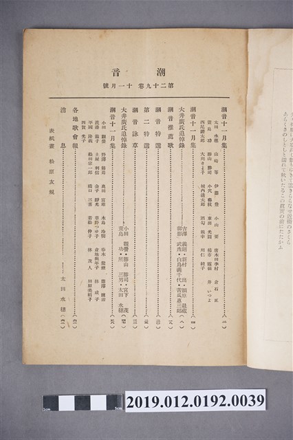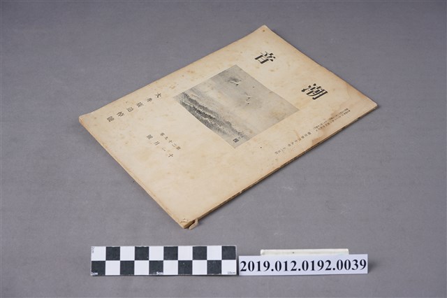 本文物為昭和18年(1943年)11月1日所發行的潮音雜誌第29卷11月號,以3隻鶴飛越浪潮的畫為其封面,並在左下角寫有「大井廣追悼號」等字。全書以日文書寫,內容為短歌、詩歌等,在末頁,則附有相關出版社的活動訊息及相關投稿的規約。潮音雜誌的出版社為潮音社,其編輯兼發行人為太田貞一,其定價為金50錢,而朝鮮、臺灣等外地則為金55錢。 期刊被命名為雜誌,雜誌一詞,其起源有二,有一說為中國古代紀載傳說、故事等的筆記,所產生的古詞語,在1862年倫敦傳教會的麥嘉湖創辦《中外雜誌》,其英文名為Chinese